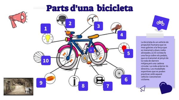 La bicicleta és un vehicle de propulsió humana que es mou gràcies a la força que es transmet a dues rodes alineades.[1] El ciclista fa una força sobre els pedals, que es transmet al pinyó de la roda de darrere mitjançant una cadena circular. La roda anterior és directriu. Les modalitats esportives que es poden practicar amb aquest vehicle s'anomenen ciclisme.