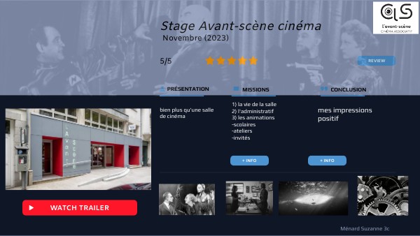 la vie de la salle l'administratif les animations -accueil des scolaires -préparation des ateliers -venue d'un réalisateur