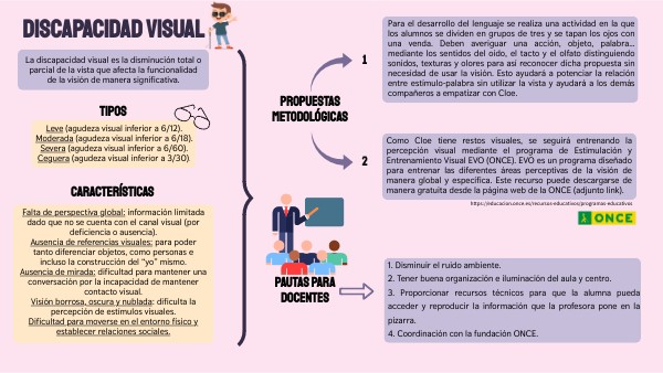 Como Cloe tiene restos visuales, se seguirá entrenando la percepción visual mediante el programa de Estimulación y Entrenamiento Visual EVO (ONCE). EVO es un programa diseñado para entrenar las diferentes áreas perceptivas de la visión de manera global y específica. Este recurso puede descargarse de manera gratuita desde la página web de la ONCE (adjunto link).