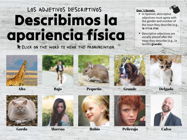 - In Spanish, descriptive adjectives must agree with the gender and number of the noun they describe (e.g., la chica alta).
