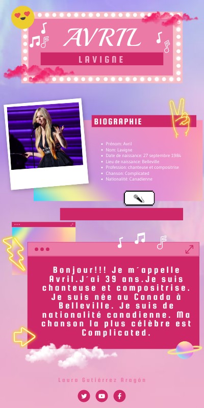 Bonjour!!! Je m´appelle Avril.J´ai 39 ans.Je suis chanteuse et compositrise. Je suis née au Canada à Belleville. Je suis de nationalité canadienne. Ma chanson la plus célèbre est Complicated.