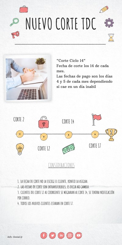 "Corte Ciclo 14" Fecha de corte los 14 de cada mes. Las fechas de pago son los días 4 y 5 de cada mes dependiendo si cae en un día inabil