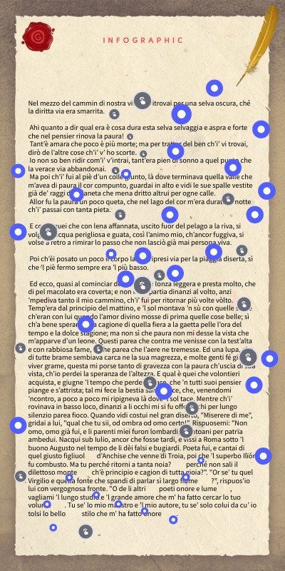 Nel mezzo del cammin di nostra vita mi ritrovai per una selva oscura, ché la diritta via era smarrita. Ahi quanto a dir qual era è cosa dura esta selva selvaggia e aspra e forte che nel pensier rinova la paura! Tant’è amara che poco è più morte; ma per trattar del ben ch’i’ vi trovai, dirò de l’altre cose ch’i’ v’ ho scorte. Io non so ben ridir com’i’ v’intrai, tant’era pien di sonno a quel punto che la verace via abbandonai. Ma poi ch’i’ fui al piè d’un colle giunto, là dove terminava quella valle che m’avea di paura il cor compunto, guardai in alto e vidi le sue spalle vestite già de’ raggi del pianeta che mena dritto altrui per ogne calle. Allor fu la paura un poco queta, che nel lago del cor m’era durata la notte ch’i’ passai con tanta pieta. E come quei che con lena affannata, uscito fuor del pelago a la riva, si volge a l’acqua perigliosa e guata, così l’animo mio, ch’ancor fuggiva, si volse a retro a rimirar lo passo che non lasciò già mai persona viva. Poi ch’èi posato un poco il corpo lasso, ripresi via per la piaggia diserta, sì che ’l piè fermo sempre era ’l più basso. Ed ecco, quasi al cominciar de l’erta, una lonza leggera e presta molto, che di pel macolato era coverta; e non mi si partia dinanzi al volto, anzi ’mpediva tanto il mio cammino, ch’i’ fui per ritornar più volte vòlto. Temp’era dal principio del mattino, e ’l sol montava ’n sù con quelle stelle ch’eran con lui quando l’amor divino mosse di prima quelle cose belle; sì ch’a bene sperar m’era cagione di quella fiera a la gaetta pelle l’ora del tempo e la dolce stagione; ma non sì che paura non mi desse la vista che m’apparve d’un leone. Questi parea che contra me venisse con la test’alta e con rabbiosa fame, sì che parea che l’aere ne tremesse. Ed una lupa, che di tutte brame sembiava carca ne la sua magrezza, e molte genti fé già viver grame, questa mi porse tanto di gravezza con la paura ch’uscia di sua vista, ch’io perdei la speranza de l’altezza. E qual è quei che volontieri acquista, e giugne ’l tempo che perder lo face, che ’n tutti suoi pensier piange e s’attrista; tal mi fece la bestia sanza pace, che, venendomi ’ncontro, a poco a poco mi ripigneva là dove ’l sol tace. Mentre ch’i’ rovinava in basso loco, dinanzi a li occhi mi si fu offerto chi per lungo silenzio parea fioco. Quando vidi costui nel gran diserto, "Miserere di me", gridai a lui, "qual che tu sii, od ombra od omo certo!". Rispuosemi: "Non omo, omo già fui, e li parenti miei furon lombardi, mantoani per patrïa ambedui. Nacqui sub Iulio, ancor che fosse tardi, e vissi a Roma sotto ’l buono Augusto nel tempo de li dèi falsi e bugiardi. Poeta fui, e cantai di quel giusto figliuol d’Anchise che venne di Troia, poi che ’l superbo Ilïón fu combusto. Ma tu perché ritorni a tanta noia? perché non sali il dilettoso monte ch’è principio e cagion di tutta gioia?". "Or se’ tu quel Virgilio e quella fonte che spandi di parlar sì largo fiume ?", rispuos’io lui con vergognosa fronte. "O de li altri poeti onore e lume , vagliami ’l lungo studio e ’l grande amore che m’ ha fatto cercar lo tuo volume . Tu se’ lo mio maestro e ’l mio autore, tu se’ solo colui da cu’ io tolsi lo bello stilo che m’ ha fatto onore .