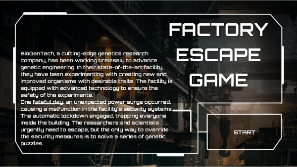 BioGenTech, a cutting-edge genetics research company, has been working tirelessly to advance genetic engineering. In their state-of-the-art facility, they have been experimenting with creating new and improved organisms with desirable traits. The facility is equipped with advanced technology to ensure the safety of the experiments. One fateful day, an unexpected power surge occurred, causing a malfunction in the facility's security systems. The automatic lockdown engaged, trapping everyone inside the building. The researchers and scientists urgently need to escape, but the only way to override the security measures is to solve a series of genetic puzzles.