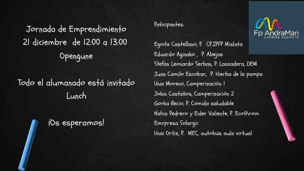 Ekintzailetza Jardunaldia 21 abendua 12: 00 13: 00 Opengune Ikasle guztiak gonbidatuta daude. Lunch Zure Zain gaude!