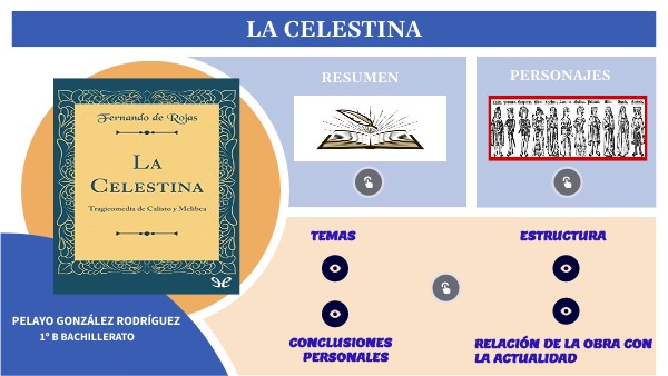 El lenguaje en el que esta escrito muchas veces no lo he entendido y hacia que me costase mucho leerlo y centrarme ya que tenia que buscar el significado o me aburria.Pero la historia que cuenta me gusto. Casi todos los personajes han tenido en final trágico por las consecuencias de todas sus acciones. La conclusión final que tengo es que el deseo de dinero por parte de La Celestina y los criados les llevo a la muerte , ella por no repartir y ellos por la rabia de no darles la parte del dinero que ellos esperaban. La muerte de Melibea es porque se queda sola (sin el amor de Calisto al morir èl) y tener que explicar a sus padres las acciones y consecuencias de su amor.