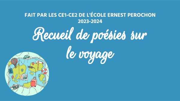 En lien avec la thématique de la période 2 qui abordait le voyage, les CE1-CE2 ont écrit des poèmes qu'ils ont ensuite illustrés. L'objectif qui leur était donné était : - écrire au présent - utiliser tous les pronoms personnels - faire des rimes - parler du voyage - avoir un titre. Les élèves ont écrit leurs poèmes sur du papier puis les ont recopiés sur l'ordinateur. Leurs propres poèmes et dessins sont dans leurs cahiers de poésie. Vous retrouverez dans ce recueil toutes leurs productions. Les maitresses