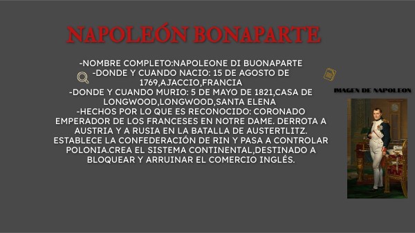 -NOMBRE COMPLETO:Napoleone di buonaparte-donde y cuando nacio: 15 de agosto de 1769,ajaccio,francia -donde y cuando murio: 5 de mayo de 1821,casa de longwood,longwood,santa elena -hechos por lo que es reconocido: coronado emperador de los franceses en notre dame. derrota a austria y a rusia en la batalla de austertlitz. establece la confederación de rin y pasa a controlar polonia.crea el sistema continental,destinado a bloquear y arruinar el comercio inglés.