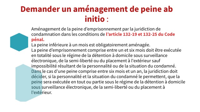 Aménagement de la peine d’emprisonnement par la juridiction de condamnation dans les conditions de l’article 132-19 et 132-25 du Code pénal. La peine inférieure à un mois est obligatoirement aménagée. La peine d’emprisonnement comprise entre un et six mois doit être exécutée en totalité sous le régime de la détention à domicile sous surveillance électronique, de la semi-liberté ou du placement à l'extérieur sauf impossibilité résultant de la personnalité ou de la situation du condamné. Dans le cas d’une peine comprise entre six mois et un an, la juridiction doit décider, si la personnalité et la situation du condamné le permettent, que la peine sera exécutée en tout ou partie sous le régime de la détention à domicile sous surveillance électronique, de la semi-liberté ou du placement à l'extérieur.
