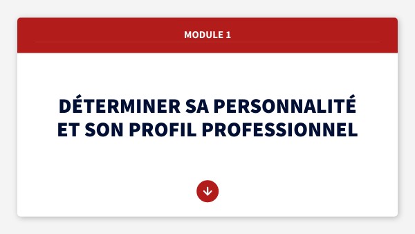 Dans ce module 1, nous allons tenter de définir ensemble votre personnalité, ainsi que votre profil professionnel. Il est important de mieux se connaître pour mettre en avant ses qualités, ses compétences, ses expériences professionnelles. En vous connaissant davantage, il sera plus facile pour vous de trouver un emploi correspondant à vos attentes, à votre personnalité et à votre profil et ainsi de vous épanouir pleinement dans votre futur métier.