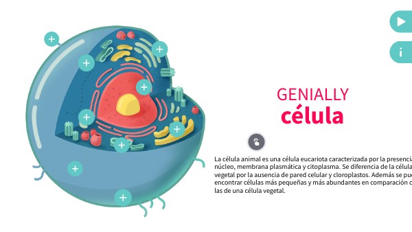 La célula animal es una célula eucariota caracterizada por la presencia de núcleo, membrana plasmática y citoplasma. Se diferencia de la célula vegetal por la ausencia de pared celular y cloroplastos. Además se pueden encontrar células más pequeñas y más abundantes en comparación con las de una célula vegetal.