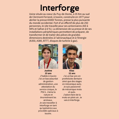 Justine 23 ans J’habite à Issoire J’ai un baccalauréat de gestion administration, une attestation du service civique, le PSC1. J’aime la nature et énormément les animaux. Je vais travailler à Interforge en tant qu’opératrice aux procédés spéciaux à Issoire.