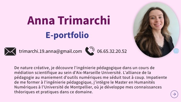 De nature créative, je découvre l'ingénierie pédagogique dans un cours de médiation scientifique au sein d'Aix-Marseille Université. L'alliance de la pédagogie au maniement d'outils numériques me séduit tout à coup. Impatiente de me former à l'ingénierie pédagogique, j'intègre le Master en Humanités Numériques à l'Université de Montpellier, où je développe mes connaissances théoriques et pratiques dans ce domaine.