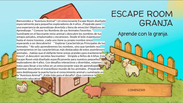 Bienvenidos a "Aventura Animal"! Un emocionante Escape Room diseñado especialmente para pequeños exploradores de 4 años. ¡Prepárate para una experiencia de aprendizaje divertida y llena de emoción! Objetivos de Aprendizaje: * Conocer los Nombres de sus Animales Favoritos: * Sumérgete en el fascinante reino animal y descubre los nombres de tus amigos peludos, emplumados y escamosos. Desde el león majestuoso hasta el mono travieso, ¡cada uno tiene su propio nombre único esperando a ser descubierto! * Explorar Características Principales de los Animales: * No solo aprenderemos los nombres, sino que también nos sumergiremos en las características más destacadas de estos asombrosos animales. ¿Sabías que el elefante tiene orejas grandes para mantenerse fresco? ¡A descubrir secretos fascinantes! Dirigido a Niños de 4 Años: Este Escape Room está diseñado específicamente para nuestros pequeños exploradores de 4 años. Con desafíos interactivos y divertidos, estamos listos para llevar a los niños en un emocionante viaje de aprendizaje mientras descubren el maravilloso mundo de los animales. ¡Prepárate para desbloquear la puerta hacia el conocimiento animal y sumérgete en la "Aventura Animal"! ¿Estás listo para el desafío? ¡Que comience la diversión educativa!