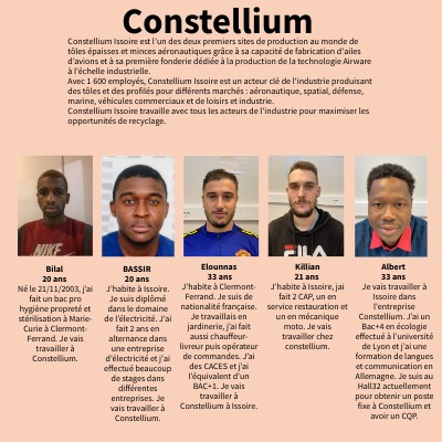 Albert 33 ans Je vais travailler à Issoire dans l'entreprise Constellium. J’ai un Bac+4 en écologie effectué à l’université de Lyon et j’ai une formation de langues et communication en Allemagne. Je suis au Hall32 actuellement pour obtenir un poste fixe à Constellium et avoir un CQP.