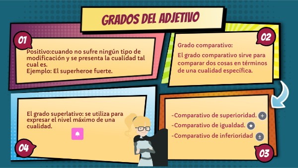 Positivo:cuando no sufre ningún tipo de modificación y se presenta la cualidad tal cual es.Ejemplo: El superheroe fuerte.
