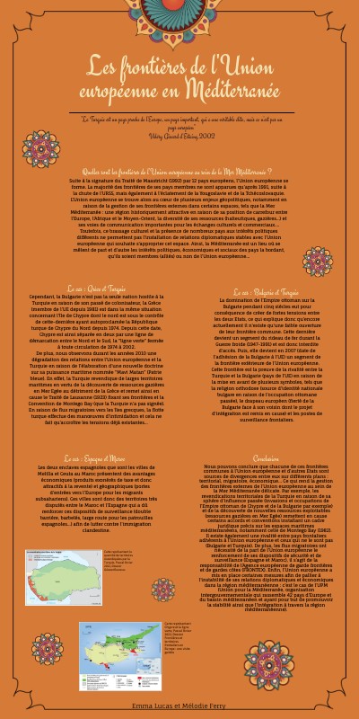 Nous pouvons conclure que chacune de ces frontières communes à l’Union européenne et d’autres Etats sont sources de divergences entre eux sur différents plans : territorial, migratoire, économique… Ce qui rend la gestion des frontières externes de l’Union européenne au sein de la Mer Méditerranée délicate. Par exemple, les revendications territoriales de la Turquie en raison de sa sphère d’influence passée (invasions et occupations de l’Empire ottoman de Chypre et de la Bulgarie par exemple) et de la découverte de nouvelles ressources exploitables (ressources gazières en Mer Egée) remettent en cause certains accords et conventions installant un cadre juridique précis sur les espaces maritimes méditerranéens, notamment celle de Montego Bay (1982). Il existe également une rivalité entre pays frontaliers adhérents à l’Union européenne et ceux qui ne le sont pas (Bulgarie et Turquie). De plus, les flux migratoires ont nécessité de la part de l’Union européenne le renforcement de ses dispositifs de sécurité et de surveillance (Espagne et Maroc), il s’agit de la responsabilité de l’Agence européenne de garde frontières et de gardes côtes (FRONTEX). Enfin, l’Union européenne a mis en place certaines mesures afin de pallier à l’instabilité de ses relations diplomatiques et économiques dans la région méditerranéenne : c’est le cas de l’UPM (Union pour la Méditerranée, organisation intergouvernementale qui rassemble 42 pays d’Europe et du bassin méditerranéen et ayant pour but de promouvoir la stabilité ainsi que l’intégration à travers la région méditerranéenne).