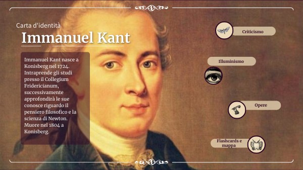 Immanuel Kant nasce a Konisberg nel 1724. Intraprende gli studi presso il Collegium Fridericianum, successivamente approfondirà le sue conosce riguardo il pensiero filosofico e la scienza di Newton. Muore nel 1804 a Konisberg.