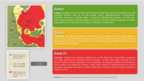 La zona de Lago es una secuencia de suelos de la antigua zona lacustre integrada, en forma general, por los siguientes estratos: Costra superficial, Formación arcillosa superior, Capa dura, Formación arcillosa inferior y Depósitos profundos; los cuales se definen por el nivel de grosor y espesor. Este tipo de zona es en la cual inciden los mayores daños y la que ha sido identificada como de peligro sísmico alto.