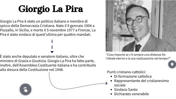 Giorgio La Pira è stato un politico italiano e membro di spicco della Democrazia Cristiana. Nato il 9 gennaio 1904 a Pozzallo, in Sicilia, e morto il 5 novembre 1977 a Firenze, La Pira è stato sindaco di quest'ultima per quattro mandati. È stato anche deputato e senatore italiano, oltre che ministro di Grazia e Giustizia. Giorgio La Pira ha fatto parte, inoltre, dell'Assemblea Costituente italiana e ha contribuito alla stesura della Costituzione nel 1948.