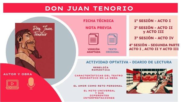 La obra de teatro titulada Don Juan Tenorio será nuestra lectura obligatoria en la 2ª evaluación. Nacida en el Romanticismo de la mano de Zorrilla es, originalmente, un drama en verso.La idea es que a partir de enero leamos y preparemos individualmente un fragmento de la obra para cada última sesión semanal que dedicaremos al comentario en grupo. Tras la lectura contaremos con una actividad creativa a modo de proyecto.