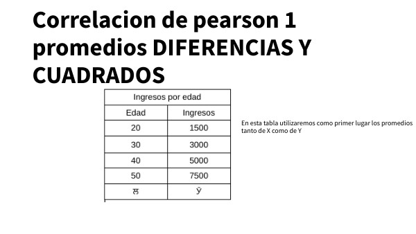 En esta tabla utilizaremos como primer lugar los promedios tanto de X como de Y