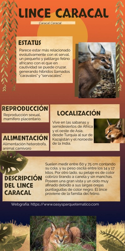 Suelen medir entre 60 y 75 cm contando su cola, y su peso oscila entre los 14 y 17 kilos. Por otro lado, su pelaje es de color cobrizo tirando a canela y sin manchas. Poseen una gran vista y un oído muy afinado debido a sus largas orejas puntiagudas de color negro. El lince proviene de la familia del felino.