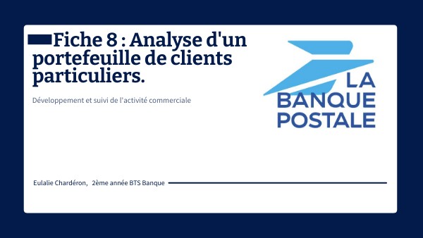 Résultats obtenus : J'ai su mettre en avant les forces et les faiblesses du portefeuille de clients particuliers et proposer des axes d'amélioration pour pallier les faiblesses.