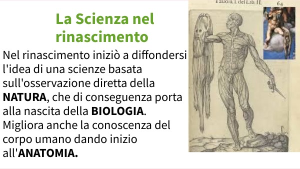 Nel rinascimento iniziò a diffondersi l'idea di una scienze basata sull'osservazione diretta della NATURA, che di conseguenza porta alla nascita della BIOLOGIA. Migliora anche la conoscenza del corpo umano dando inizio all'ANATOMIA.