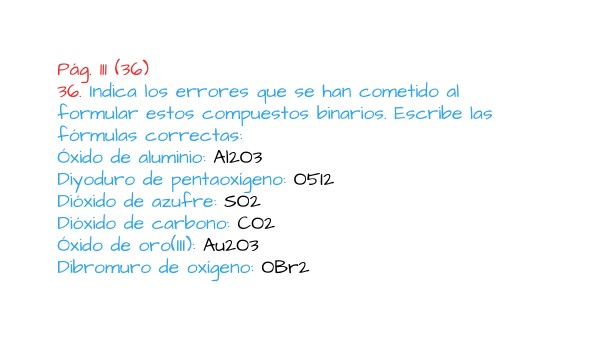 Pág. 111 (36) 36. Indica los errores que se han cometido al formular estos compuestos binarios. Escribe las fórmulas correctas: Óxido de aluminio: Al2O3 Diyoduro de pentaoxígeno: O5I2 Dióxido de azufre: SO2 Dióxido de carbono: CO2 Óxido de oro(III): Au2O3 Dibromuro de oxígeno: OBr2