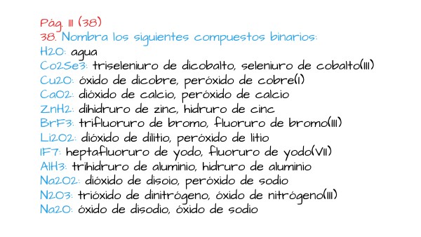 Pág. 111 (38) 38. Nombra los siguientes compuestos binarios: H2O: agua Co2Se3: triseleniuro de dicobalto, seleniuro de cobalto(III) Cu2O: óxido de dicobre, peróxido de cobre(I) CaO2: dióxido de calcio, peróxido de calcio ZnH2: dihidruro de zinc, hidruro de cinc BrF3: trifluoruro de bromo, fluoruro de bromo(III) Li2O2: dióxido de dilitio, peróxido de litio IF7: heptafluoruro de yodo, fluoruro de yodo(VII) AlH3: trihidruro de aluminio, hidruro de aluminio Na2O2: dióxido de disoio, peróxido de sodio N2O3: trióxido de dinitrógeno, óxido de nitrógeno(III) Na2O: óxido de disodio, óxido de sodio