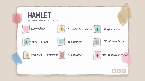 - Hamlet:is the tragic main character of William Shakespeare's novel "Hamlet." He is a complex young prince of Denmark. Which is haunted by his father's ghost. I like this character because he reflects pain and suffering very well. - Ofelia:is a character in Shakespeare's "Hamlet," which represent the gentle and obedient daughter of Polonius. Her innocence and vulnerability are seen in the novel tragic events, leading to her eventual descent into madness and tragic end. I think that this character is very interesting because she shows us what a person will do for love. - King Claudio: he is a character who, after his brother's death, marries Queen Gertrude, Hamlet's mother. He is responsible for the political manipulations that contribute to the tragic events in the play. I think he is a very important character in the work, who shows us that people are capable of doing bad things to get what they want. In this case he killed his brother