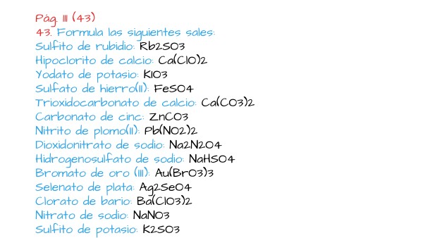 Pág. 111 (43) 43. Formula las siguientes sales: Sulfito de rubidio: Rb2SO3 Hipoclorito de calcio: Ca(ClO)2 Yodato de potasio: KIO3 Sulfato de hierro(II): FeSO4 Trioxidocarbonato de calcio: Ca(CO3)2 Carbonato de cinc: ZnCO3 Nitrito de plomo(II): Pb(NO2)2 Dioxidonitrato de sodio: Na2N2O4 Hidrogenosulfato de sodio: NaHSO4 Bromato de oro (III): Au(BrO3)3 Selenato de plata: Ag2SeO4 Clorato de bario: Ba(ClO3)2 Nitrato de sodio: NaNO3 Sulfito de potasio: K2SO3