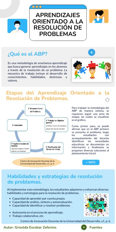 Centro de Innovación Docente de la Universidad del Desarrollo. (s.f.). Aprendizaje Basado en Problemas (ABP) [Versión digital]. Los Condes, Chile: Autor. Recuperado el 24 de diciembre de 2023, de https://innovaciondocente.udd.cl/files/2021/06/aprendizaje-basado-en-problemas_abp.pdf Universidad Tecnológica de Chile. (2019). Manual de Aprendizaje Basado en Problemas (ABP) y Aprendizaje Basado en Proyectos (ABPro). Orientaciones para su diseño e implementación en aula [Versión digital]. Chile: Subdirección De Currículum Y Docencia de la Universidad Tecnológica de Chile. Recuperado el 24 de diciembre de 2023, de https://www.inacap.cl/web/documentos/manuales-estrategias-actualizacion-2019/manual-de-aprendizaje-basado-en-problemas.pdf