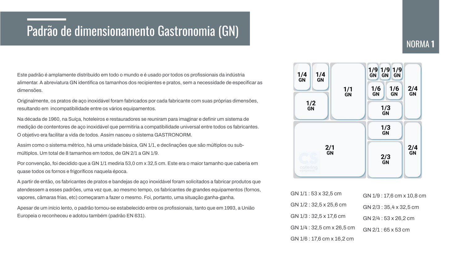 Este padrão é amplamente distribuído em todo o mundo e é usado por todos os profissionais da indústria alimentar. A abreviatura GN identifica os tamanhos dos recipientes e pratos, sem a necessidade de especificar as dimensões. Originalmente, os pratos de aço inoxidável foram fabricados por cada fabricante com suas próprias dimensões, resultando em incompatibilidade entre os vários equipamentos. Na década de 1960, na Suíça, hoteleiros e restauradores se reuniram para imaginar e definir um sistema de medição de contentores de aço inoxidável que permitiria a compatibilidade universal entre todos os fabricantes. O objetivo era facilitar a vida de todos. Assim nasceu o sistema GASTRONORM. Assim como o sistema métrico, há uma unidade básica, GN 1/1, e declinações que são múltiplos ou sub-múltiplos. Um total de 8 tamanhos em todos, de GN 2/1 a GN 1/9. Por convenção, foi decidido que a GN 1/1 mediria 53,0 cm x 32,5 cm. Este era o maior tamanho que caberia em quase todos os fornos e frigoríficos naquela época. A partir de então, os fabricantes de pratos e bandejas de aço inoxidável foram solicitados a fabricar produtos que atendessem a esses padrões, uma vez que, ao mesmo tempo, os fabricantes de grandes equipamentos (fornos, vapores, câmaras frias, etc) começaram a fazer o mesmo. Foi, portanto, uma situação ganha-ganha. Apesar de um início lento, o padrão tornou-se estabelecido entre os profissionais, tanto que em 1993, a União Europeia o reconheceu e adotou também (padrão EN 631).