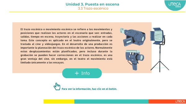 Dato relevanteDurante el trazo se debe contemplar lo siguiente: ¿Por dónde entrarán? ¿Dónde se ubicará en el escenario? ¿En qué zonas ocupará qué objetos? ¿Con quién se encontrará? ¿Dónde estará ubicado cuando termine la escena o por dónde saldrá del escenario? Si entra más de una vez, se deberá realizar un trazo escénico para cada ocasión. Todo esto deberá llevar el visto bueno del director.