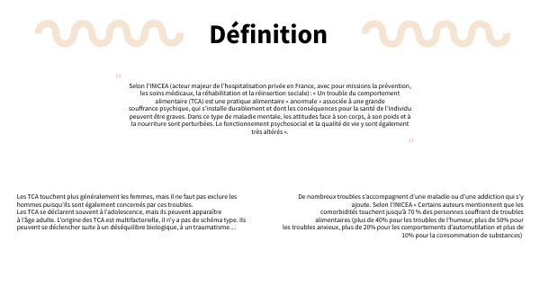 Selon l’INICEA (acteur majeur de l’hospitalisation privée en France, avec pour missions la prévention, les soins médicaux, la réhabilitation et la réinsertion sociale) : « Un trouble du comportement alimentaire (TCA) est une pratique alimentaire « anormale » associée à une grande souffrance psychique, qui s’installe durablement et dont les conséquences pour la santé de l’individu peuvent être graves. Dans ce type de maladie mentale, les attitudes face à son corps, à son poids et à la nourriture sont perturbées. Le fonctionnement psychosocial et la qualité de vie y sont également très altérés ».