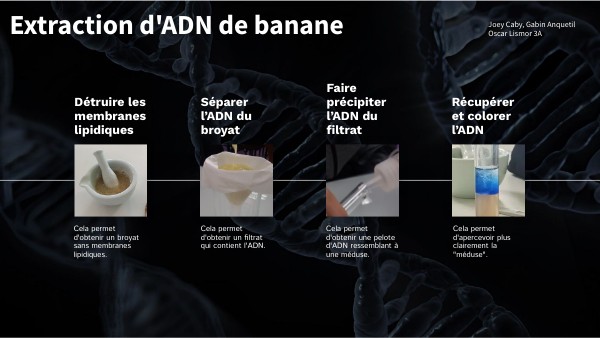 Écrasez une banane en ajoutant de l'eau à l'aide d'un mortier pour désagréger les tissus et de fragiliser les parois cellulaires. Ajoutez du sel pour éliminer les molécules d'eau liées à l'ADN, facilitant ainsi son extraction. Ajouter du liquide vaisselle pour dissoudre les membranes cellulaires et éliminer certaines protéines liées à l'ADN.