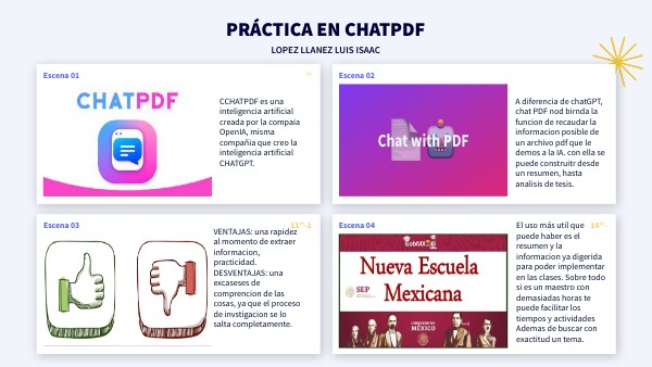 A diferencia de chatGPT, chat PDF nod birnda la funcion de recaudar la informacion posible de un archivo pdf que le demos a la IA. con ella se puede construitr desde un resumen, hasta analisis de tesis.
