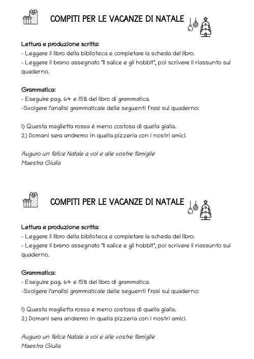 Lettura e produzione scritta: - Leggere il libro della biblioteca e completare la scheda del libro. - Leggere il brano assegnato "Il salice e gli hobbit", poi scrivere il riassunto sul quaderno. Grammatica: - Eseguire pag. 64 e 158 del libro di grammatica. -Svolgere l'analisi grammaticale delle seguenti frasi sul quaderno: 1) Questa maglietta rossa è meno costosa di quella gialla. 2) Domani sera andremo in quella pizzeria con i nostri amici. Auguro un felice Natale a voi e alle vostre famiglie Maestra Giulia