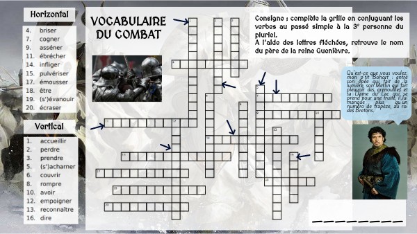 Consigne : complète la grille en conjuguant les verbes au passé simple à la 3e personne du pluriel. A l'aide des lettres fléchées, retrouve le nom du père de la reine Guenièvre.