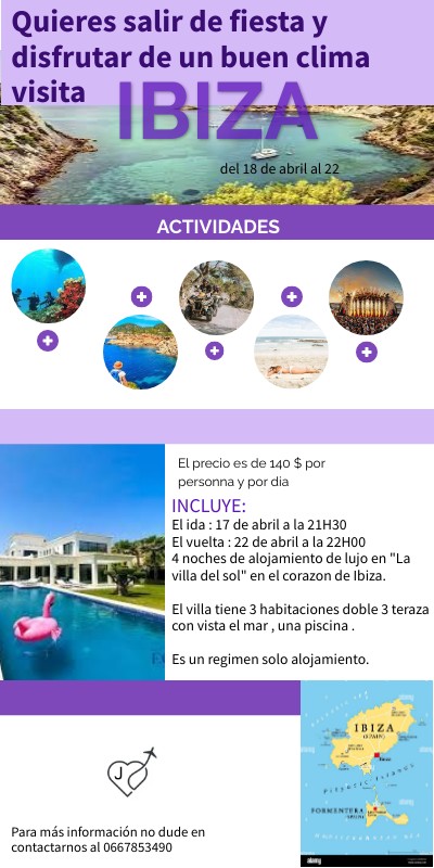 El ida : 17 de abril a las 21h30 El vuelta : 22 de abril a las 22H00 4 noches de alojamiento de lujo en "La villa del sol" en el corazon de Ibiza. El villa tiene 3 habitaciones doble 3 teraza con vista el mar , una piscina . Es un regimen solo alojamiento.