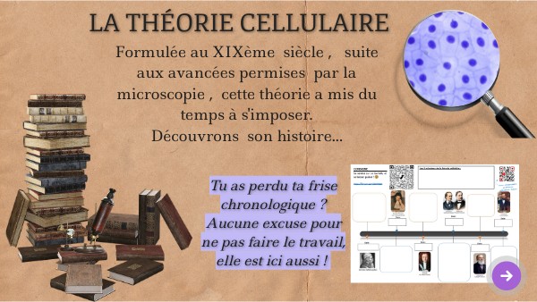 Explore les éléments du bureau et trouve les informations qui te permettront de comprendre comment la théorie cellulaire s'est construite et d'identifier ses trois principes. N'oublie pas de prendre des notes afin de compléter ta frise chronologique distribuée en classe. Tu peux revenir au bureau en cliquant sur le livre ouvert, un nouvel élément apparaitra, clique dessus ! Bonne découverte !