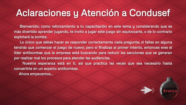 Bienvenido; como reforzamiento a tu capacitación en este tema y considerando que es más divertido aprender jugando, te invito a jugar este juego sin equivocarte, o de lo contrario explotará la bomba. Lo único que debes hacer es responder correctamente cada pregunta; si fallas en alguna tendrás que comenzar el juego de nuevo; pero si finalizas al primer intento, entonces eres el líder antibombas que la empresa está buscando para reducir las sanciones que se generan por realizar mal los procesos para atender las audiencias. Nuestra esperanza está en ti, así que practica las veces que sea necesario hasta convertirte en un experto antibombas. Ahora empecemos...