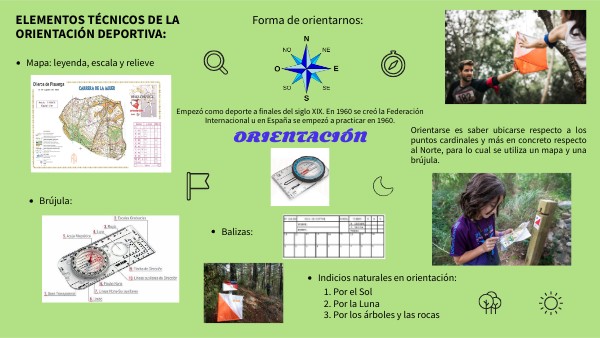 Orientarse es saber ubicarse respecto a los puntos cardinales y más en concreto respecto al Norte, para lo cual se utiliza un mapa y una brújula.