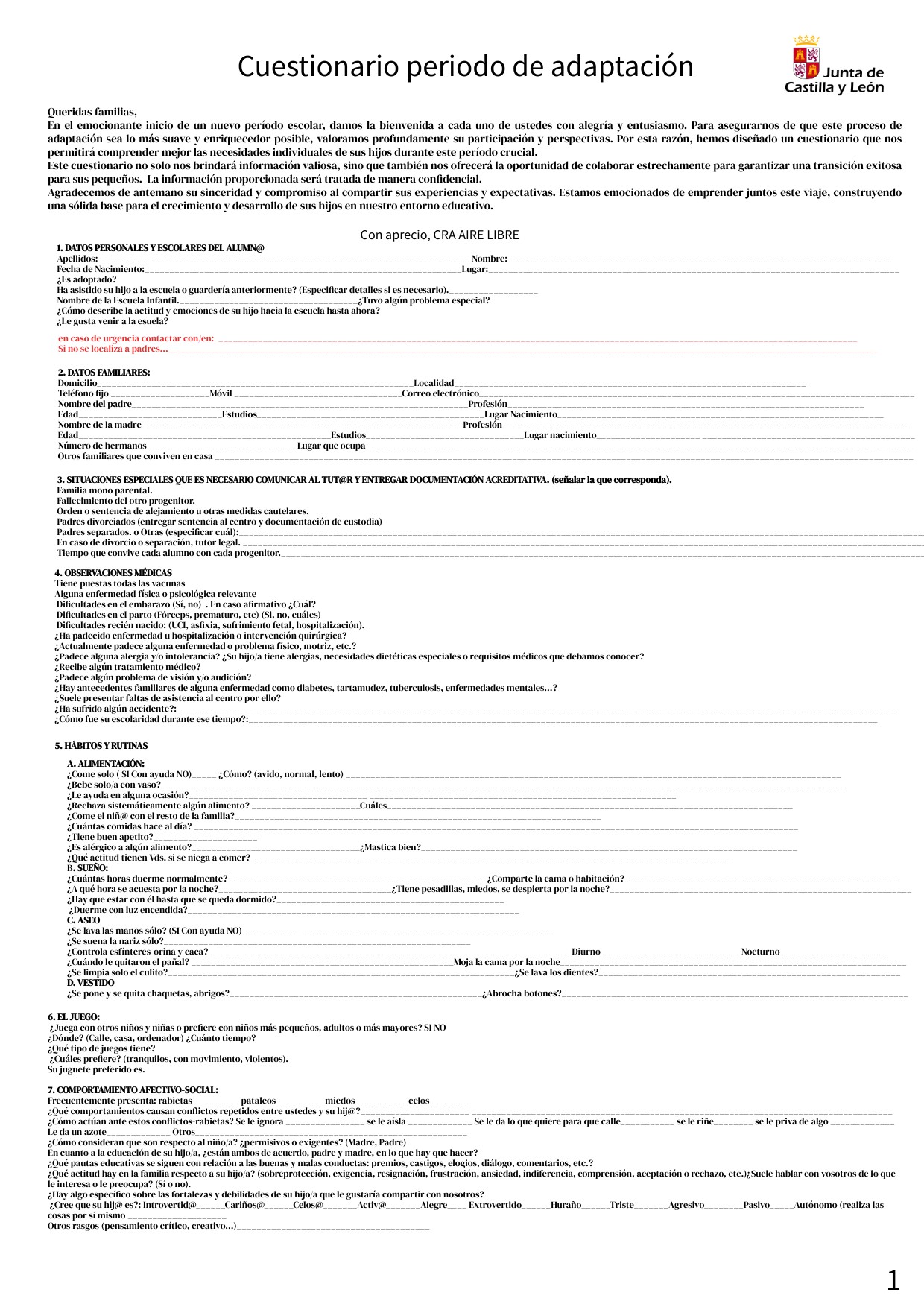Queridas familias,En el emocionante inicio de un nuevo período escolar, damos la bienvenida a cada uno de ustedes con alegría y entusiasmo. Para asegurarnos de que este proceso de adaptación sea lo más suave y enriquecedor posible, valoramos profundamente su participación y perspectivas. Por esta razón, hemos diseñado un cuestionario que nos permitirá comprender mejor las necesidades individuales de sus hijos durante este período crucial.Este cuestionario no solo nos brindará información valiosa, sino que también nos ofrecerá la oportunidad de colaborar estrechamente para garantizar una transición exitosa para sus pequeños. La información proporcionada será tratada de manera confidencial.Agradecemos de antemano su sinceridad y compromiso al compartir sus experiencias y expectativas. Estamos emocionados de emprender juntos este viaje, construyendo una sólida base para el crecimiento y desarrollo de sus hijos en nuestro entorno educativo.