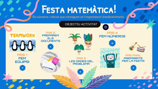 Per tal de comunicar els vostres resultats i que triïn la vostra proposta cal que entregueu tots els documents que us demanaven i resumiu la informació d'interès per exposar-la, màxim en 2 minuts. Podeu respondre a les següents qüestions: + Quins aspectes donen valor a la vostra festa? + Quin pressupost final es necessita? + Quin procés d'aprenentatge us ha aportat l'activitat?