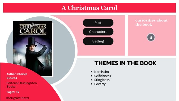 The book tells the story of a rich old stingy man, who was not empathetic at all and who did not like Christmas. All this changes when his dead partner appears to him and warns him that three ghosts will visit him that night and that he still has time to change so that people love him and not die alone. The ghosts were from the past, present and future. The one from the past taught him that he had been selfish by leaving his girlfriend because he was poor and because of the money.The ghost of the present taught him that he had to be a better person because his employee was going through a bad time with his sick son and he still treated him badly. The ghost of the future taught him that if he did not change, he would die alone and the son of his employee would die from his illness. After all that, he decided it was time to change and be a better person. So he went to his nephew's house and ate with them, donated money to the poor and raised the salary of his employee. Also the following year he prepared a big Christmas dinner and invited his family and his employee's family.
