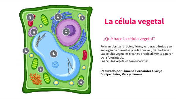 Forman plantas, árboles, flores, verduras o frutas y se encargan de que éstas puedan crecer y desarollarse.Las células vegetales crean su propio alimento a partir de la fotosíntesis.Las células vegetales son eucariotas.