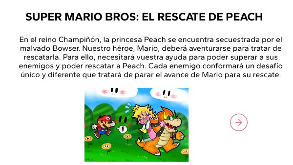 En el reino Champiñón, la princesa Peach se encuentra secuestrada por el malvado Bowser. Nuestro héroe, Mario, deberá aventurarse para tratar de rescatarla. Para ello, necesitará vuestra ayuda para poder superar a sus enemigos y poder rescatar a Peach. Cada enemigo conformará un desafío único y diferente que tratará de parar el avance de Mario para su rescate.